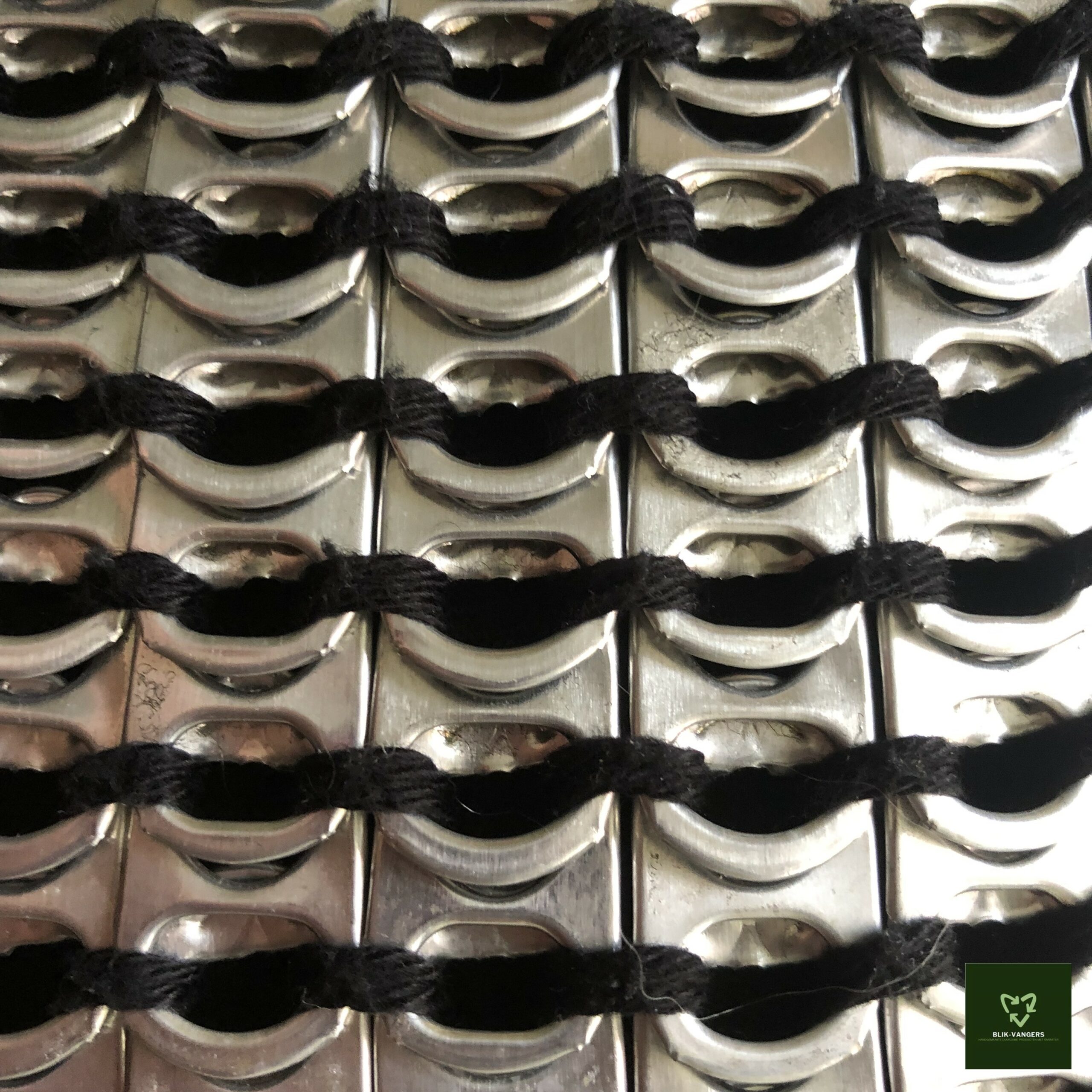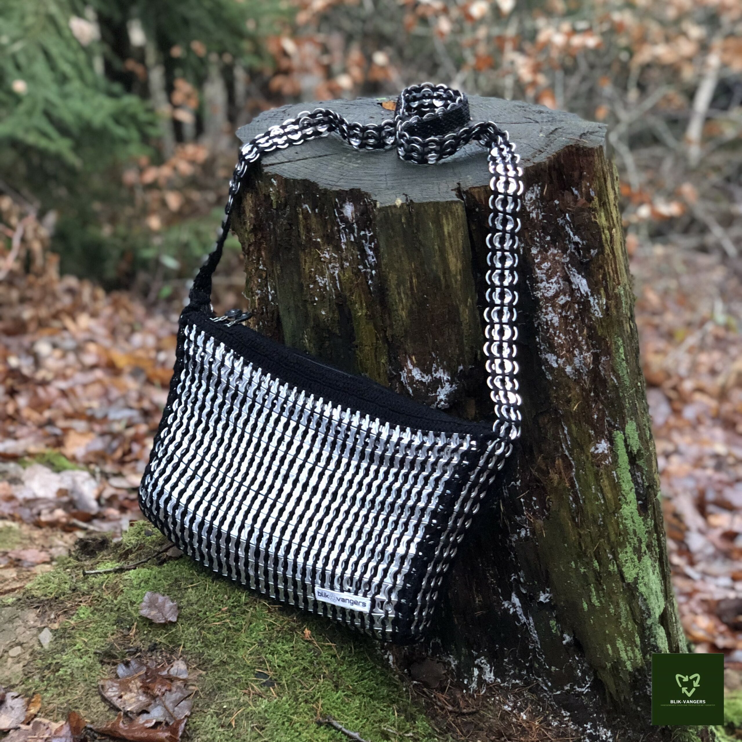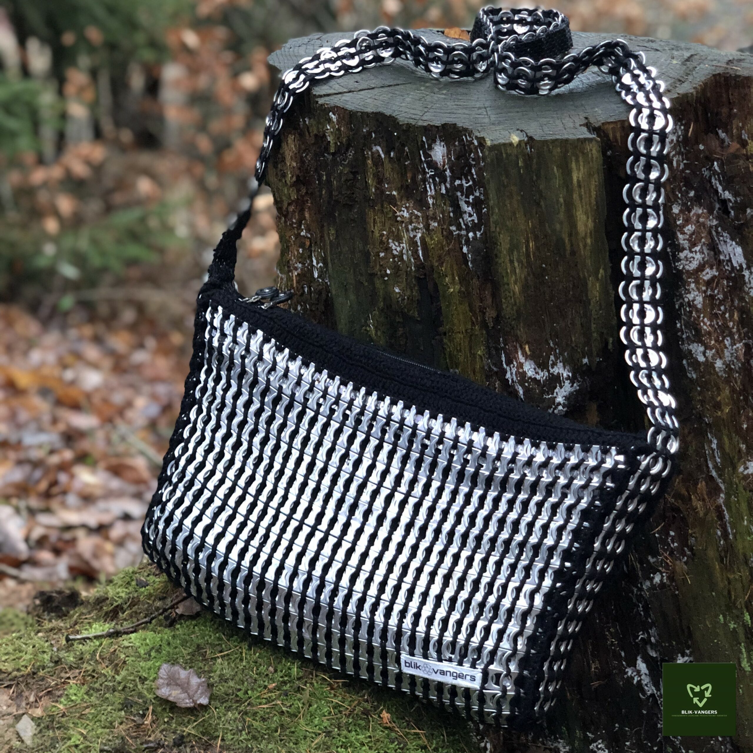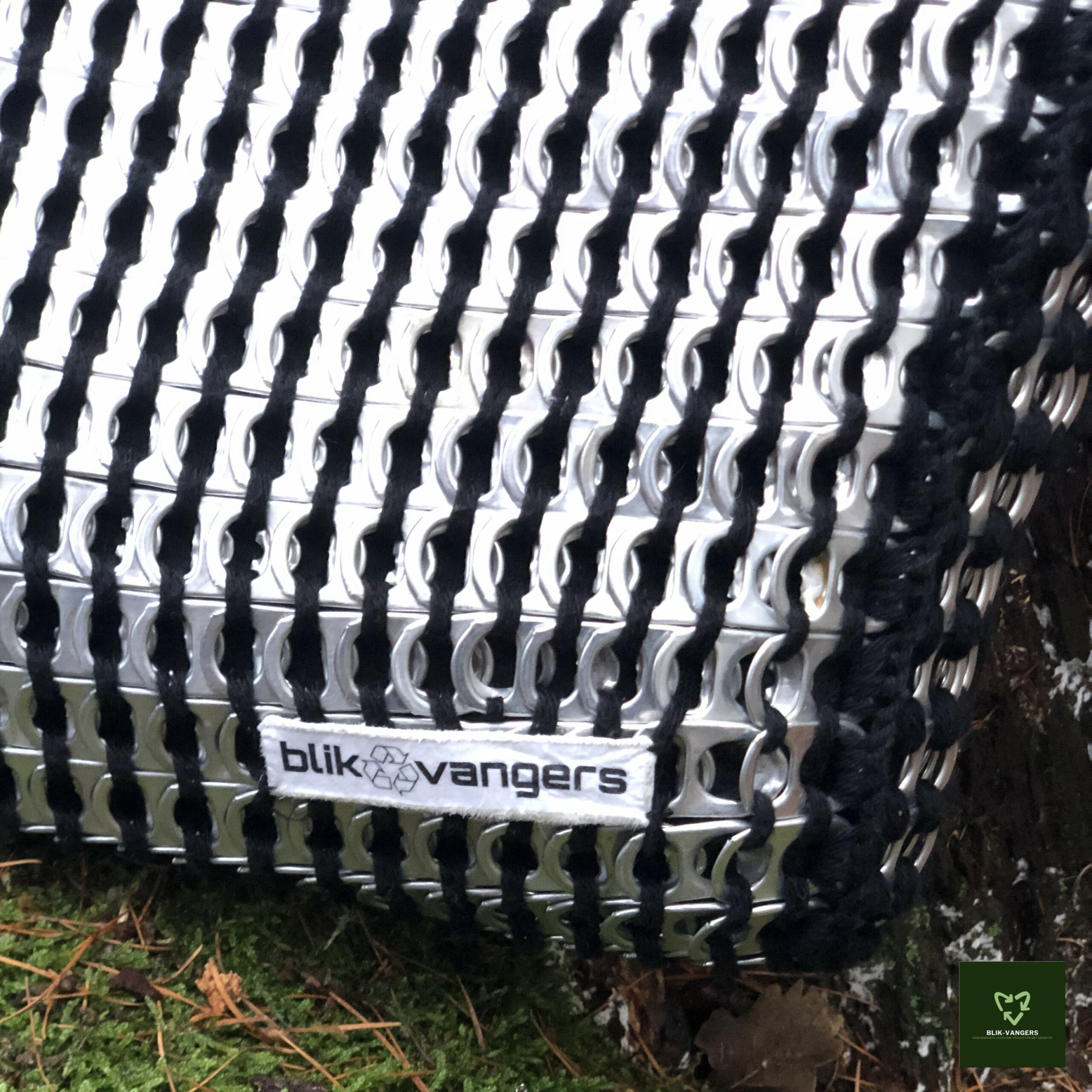 Dit is de allereerste bliklipjes tas die door blik♻vangers in productie is genomen. Voor de tas zijn ongeveer 1000 zilverkleurige bliklipjes gebruikt. Deze zijn met zwart katoen aan elkaar gehaakt tot een stevig geheel. Het hengsel is ook gemaakt van lipjes en zit vastgehaakt aan de zijkanten van de tas. Hierdoor behoudt zowel de tas als het hengsel zijn stevigheid. In de rechter onderhoek van de tas zit het logo. Natuurlijk is het logo geprint op een oud stukje leer. Blik♻vangers blijft natuurlijk zoveel mogelijk recyclen!