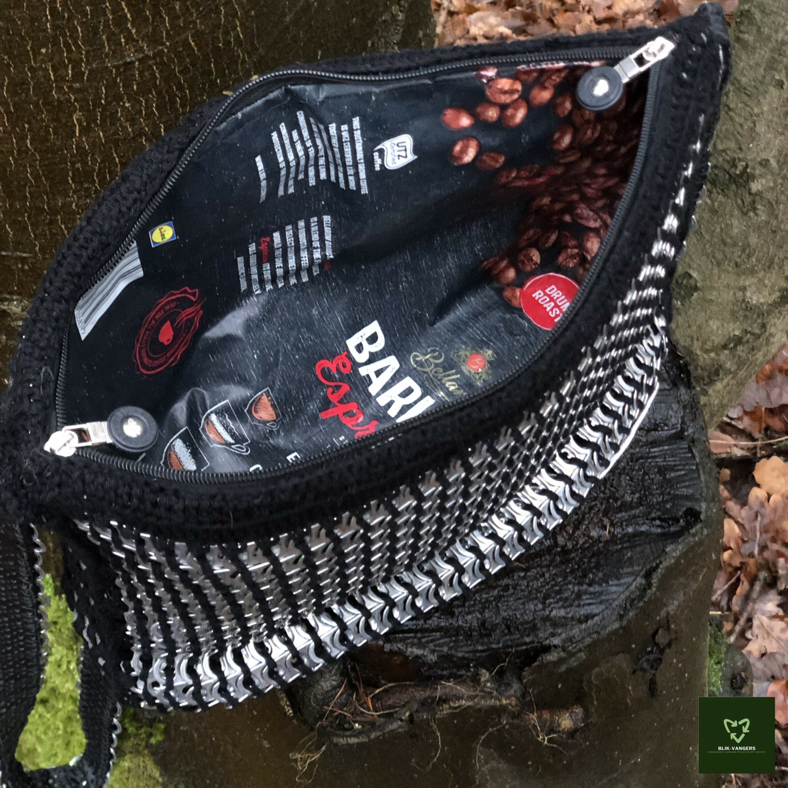 De koffie blik♻vanger tas is allereerste bliklipjes tas die in productie is gegaan. Wat deze tas uniek maakt, is dat hij gevoerd is met een koffieverpakking, vandaar de naam. Als je in de tas kijkt, zie je pas echt goed dat de binnenkant gemaakt is van een lege koffiebonen verpakking. Je kan de koffiebonen bijna nog ruiken! De donkere kleur van de koffieverpakking past goed bij het zwarte katoen waar bliklipjes mee aan elkaar gehaakt zijn. In deze tas zitten ongeveer 1000 zilverkleurige lipjes.