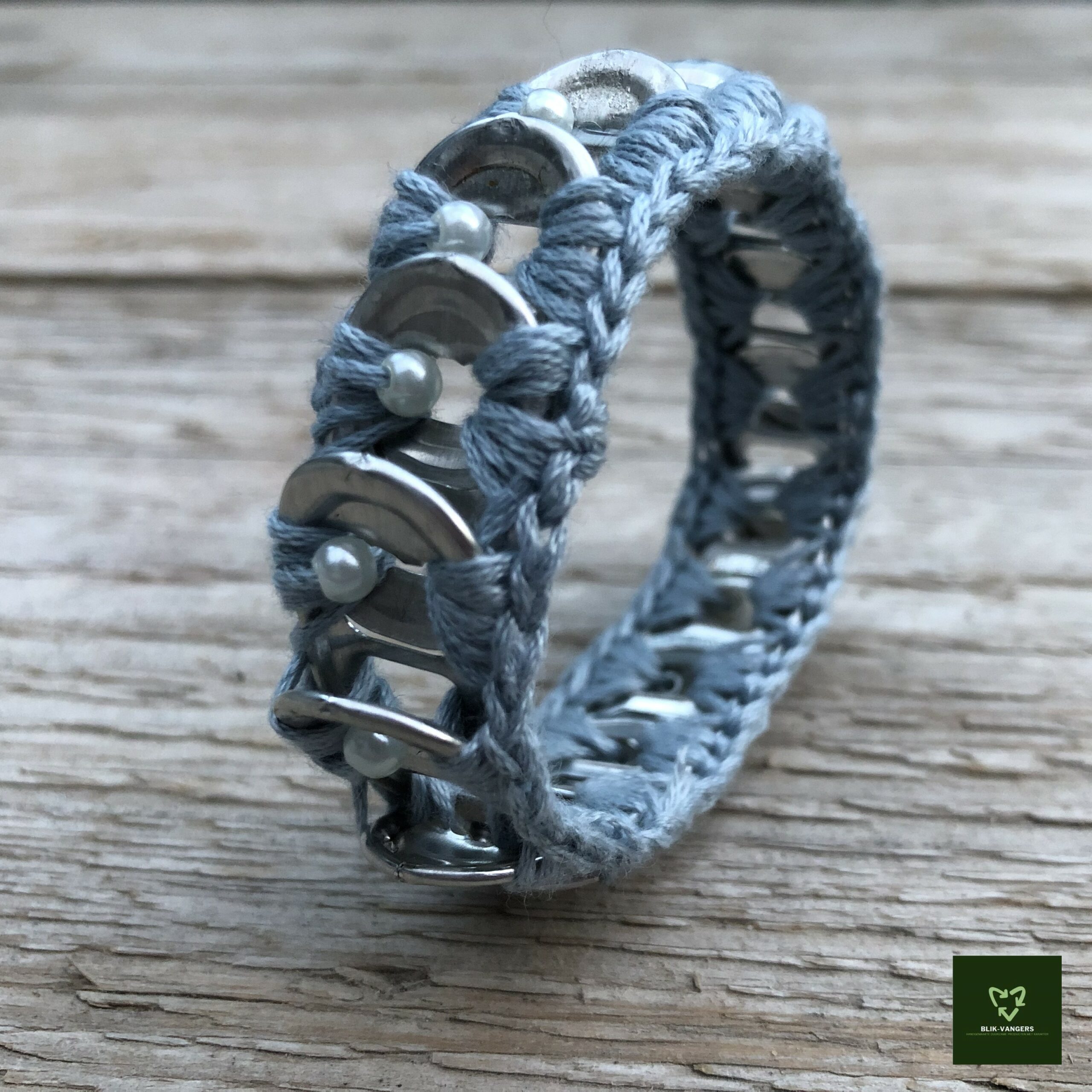 De bliklipjes worden over elkaar heen gehaakt, waardoor het niet meteen opvalt dat de armband is gemaakt van treklipjes. Als je het sieraad van dichtbij inspecteert, vallen zowel de parelkraaltjes als de lipjes beter op. De kleur en vorm van deze metalen schakels creëren samen met het garen een opvallend visueel effect.