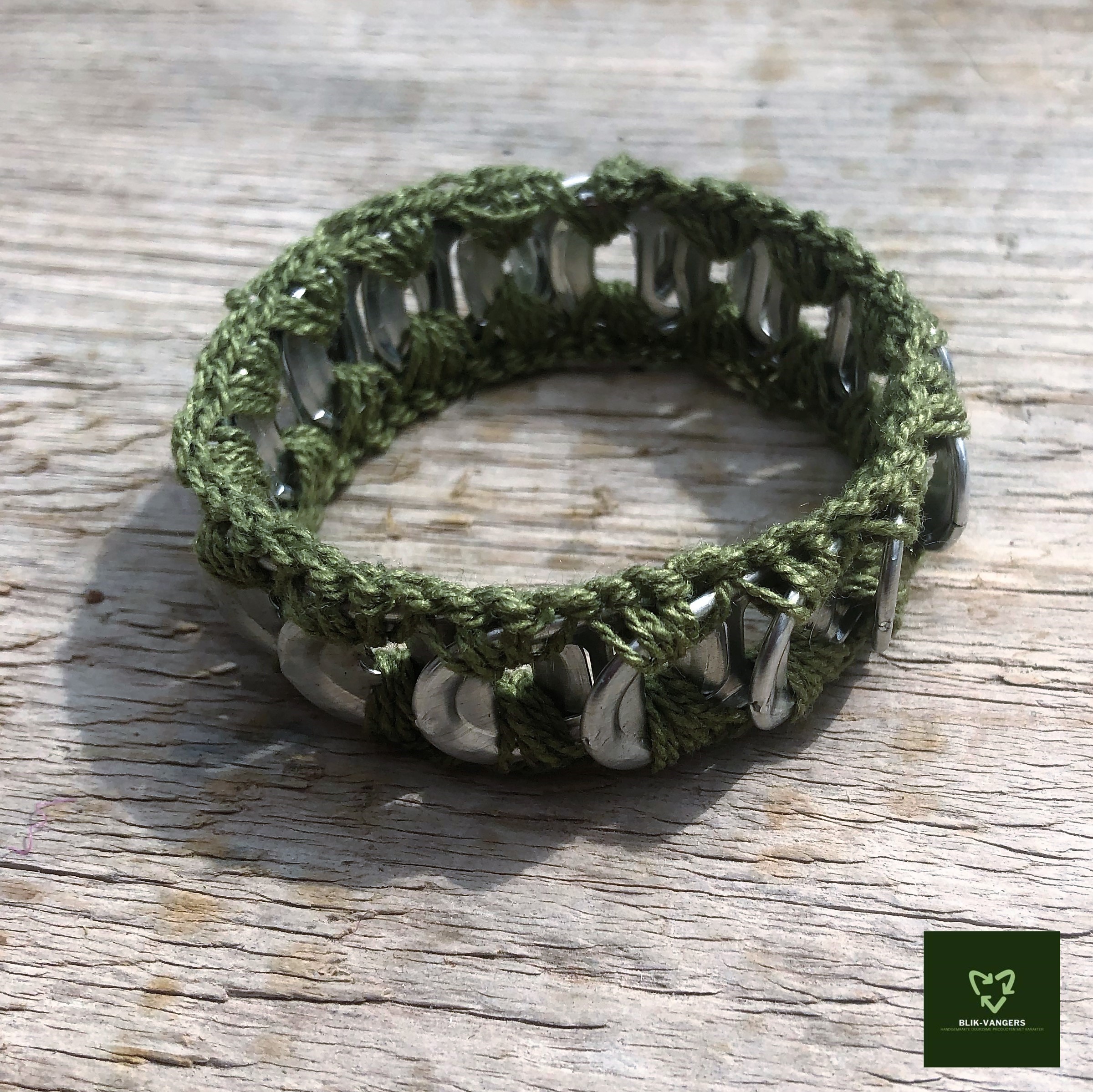 zilver legergroene armband gehaakt van gerecyclede treklipjes van sodablikjes