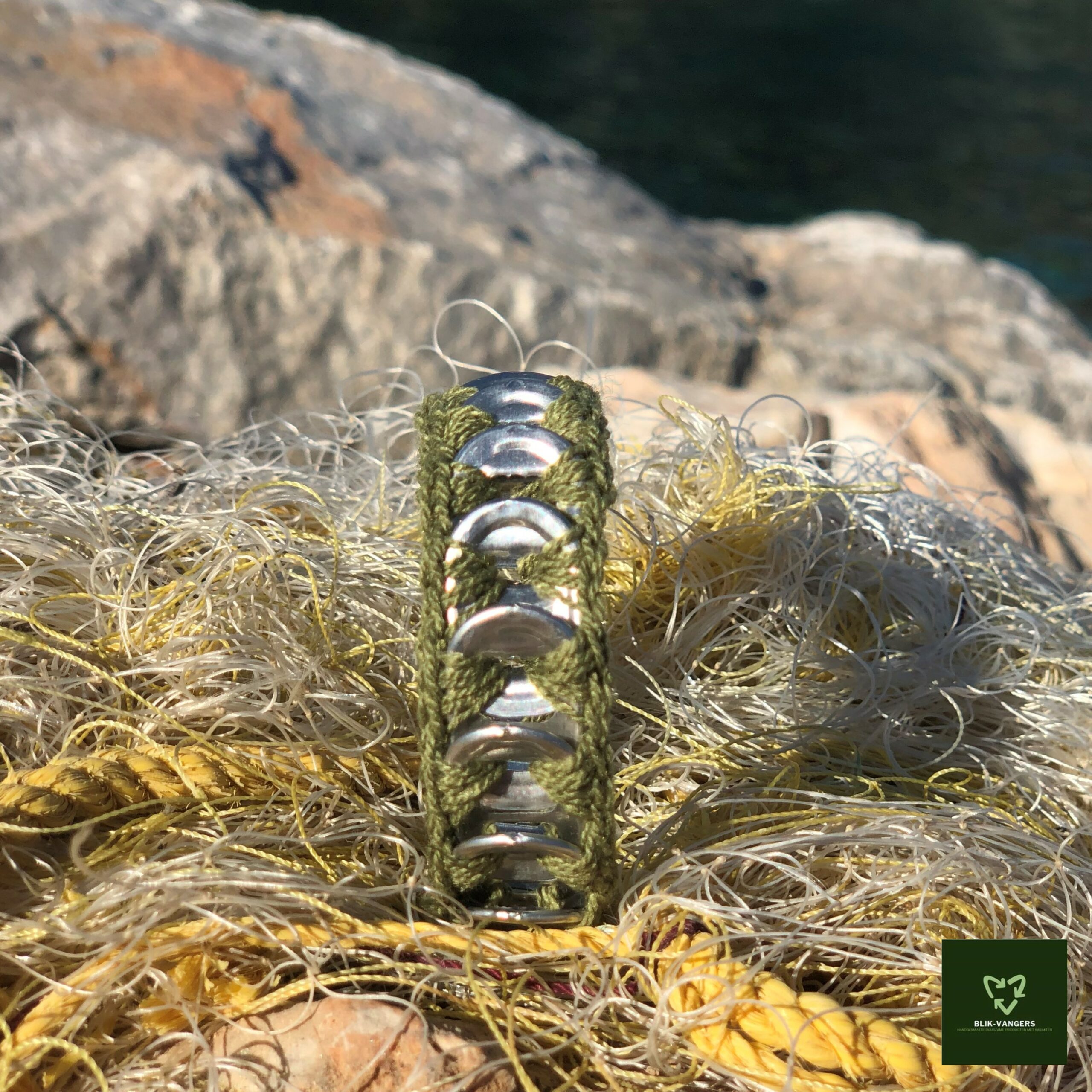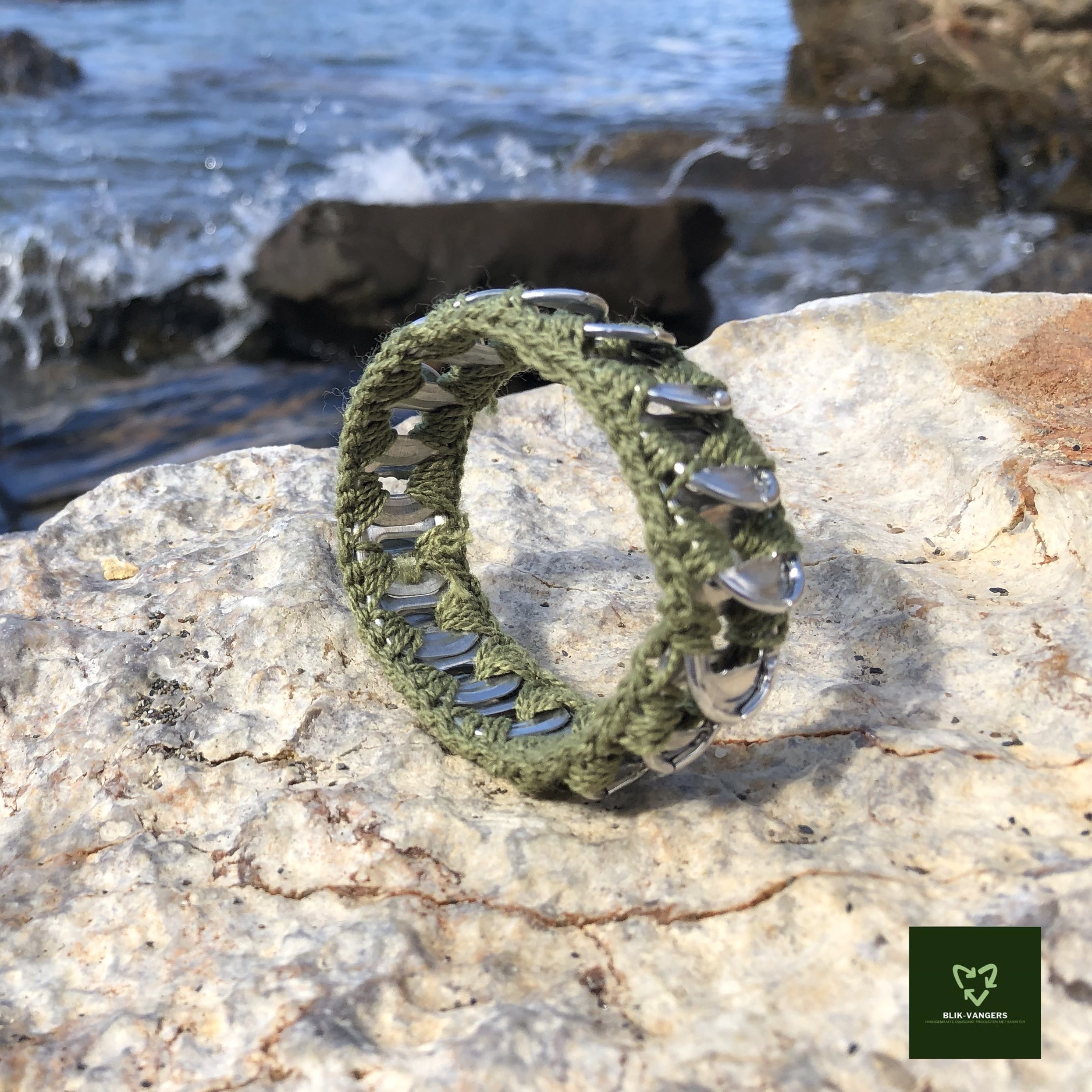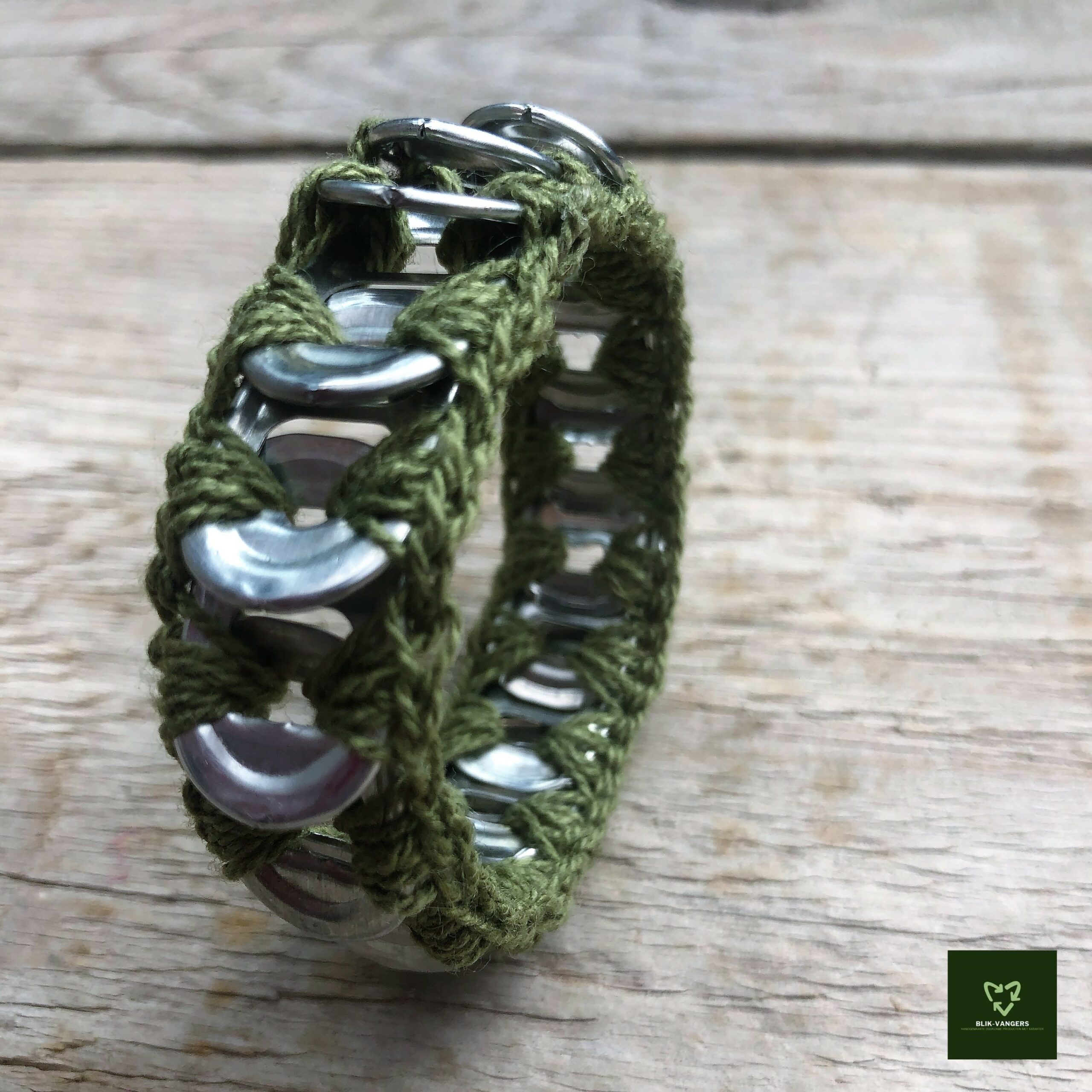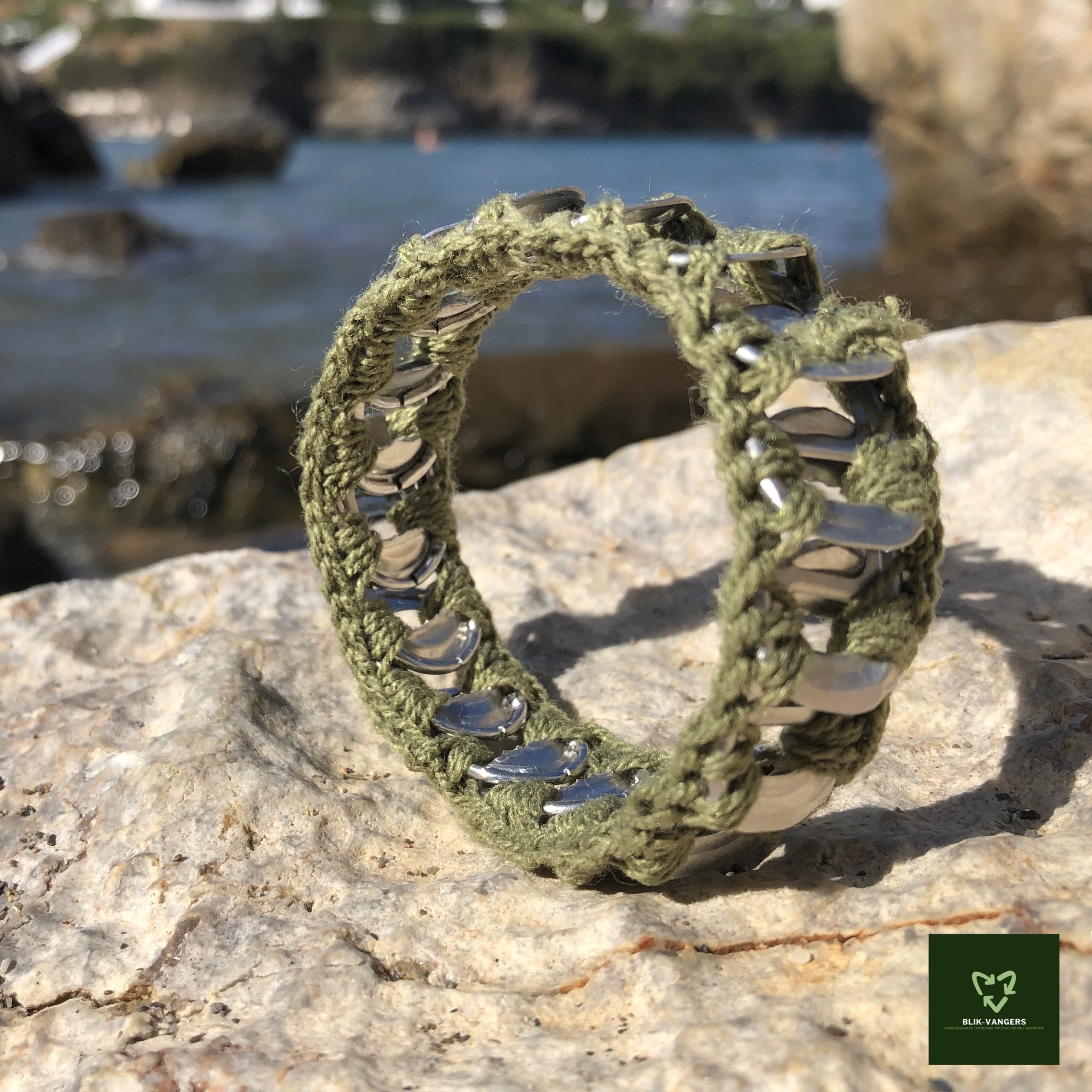 Deze zilver legergroene bliklipjes armband maakt jouw outfit compleet. De armband van Blik♻vangers is duurzaam en stoer tegelijk! Het is een bijzonder en uniek sieraad door het gebruikte materiaal: ge-upcyclede bliklipjes die aan elkaar zijn gehaakt met een gerecycled garen. De treklipjes zijn afkomstig van lege bier- of frisdrankblikjes.