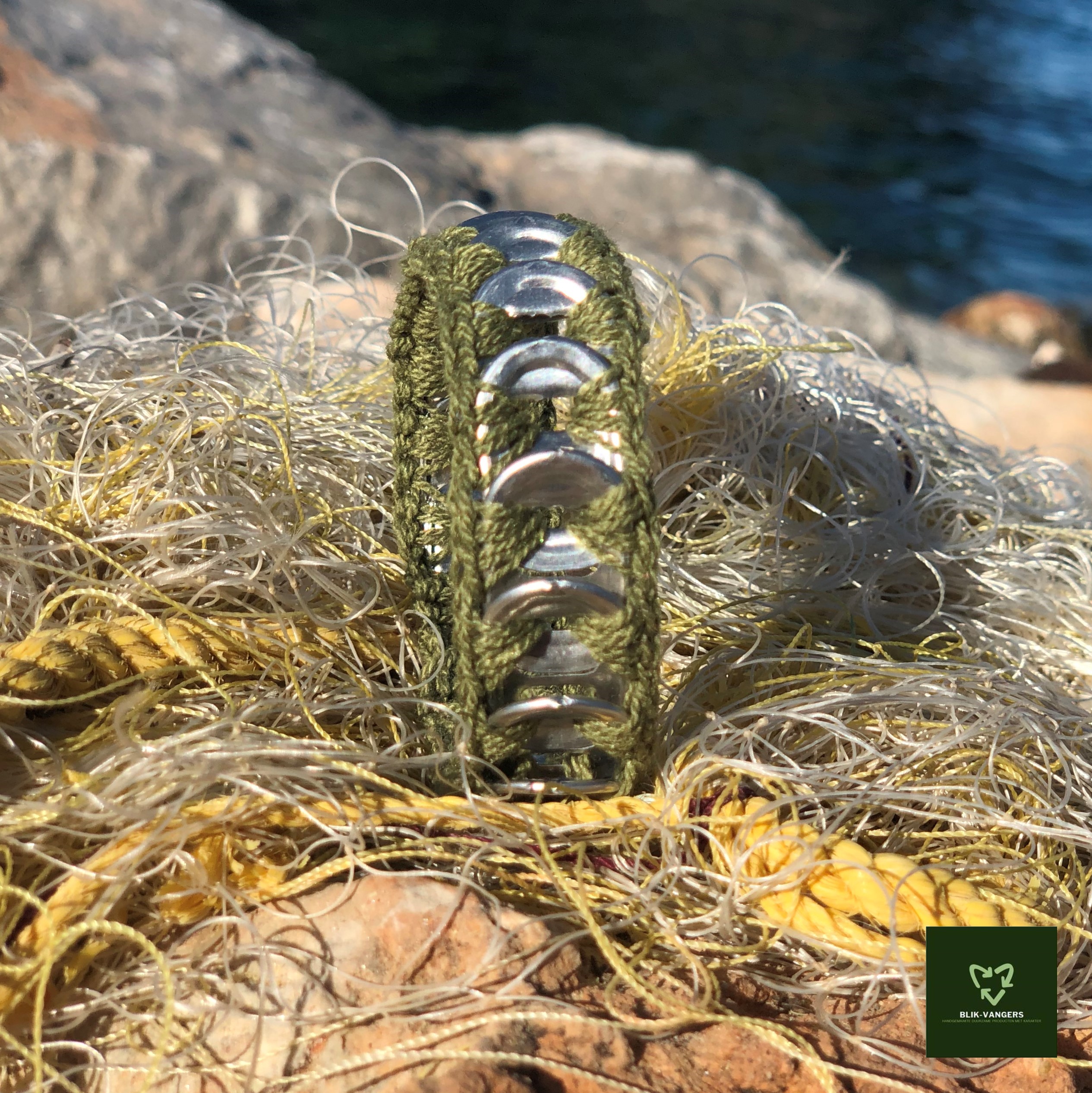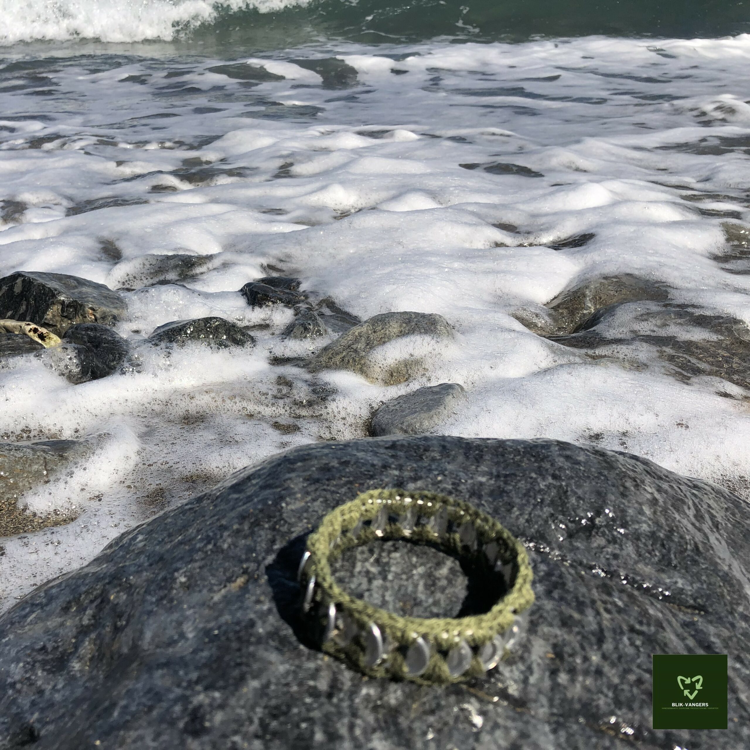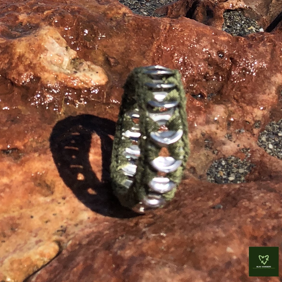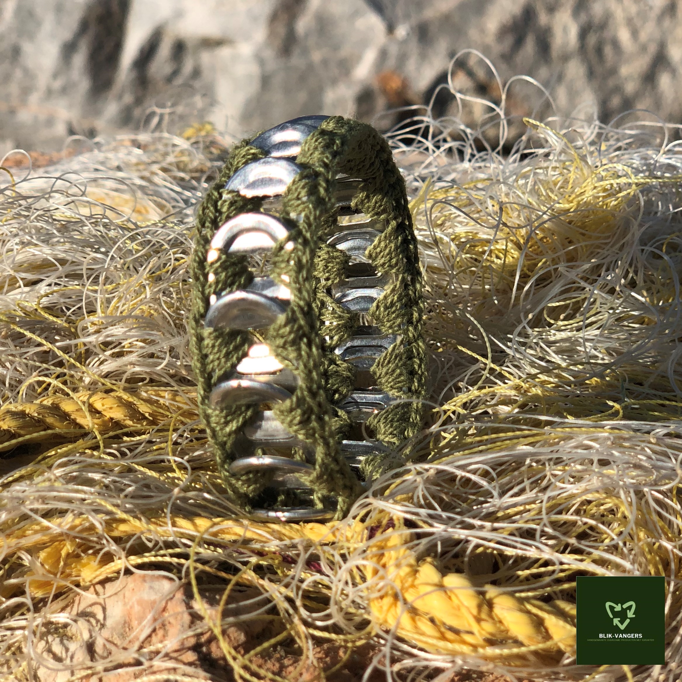 Deze zilver legergroene bliklipjes armband maakt jouw outfit compleet. De armband van Blik♻vangers is duurzaam en stoer tegelijk! Het is een bijzonder en uniek sieraad door het gebruikte materiaal: ge-upcyclede bliklipjes die aan elkaar zijn gehaakt met een gerecycled garen. De treklipjes zijn afkomstig van lege bier- of frisdrankblikjes.